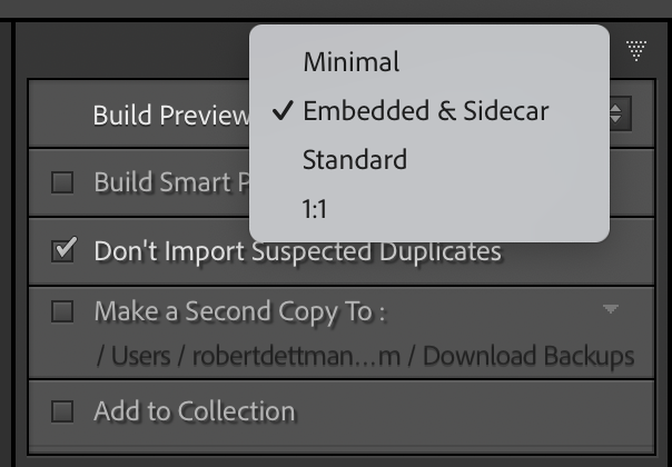 Select 1:1 previews if you want that to apply to all the imported images. Bear in mind that this takes time. The 1:1 files are large, so over time, a lot of disk space will be used unless you have Lightroom delete them automatically. Do that in Lightroom Settings.